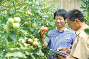 看著長(zhǎng)勢(shì)良好的西紅柿,李鋒(左)的臉上掛滿笑容。